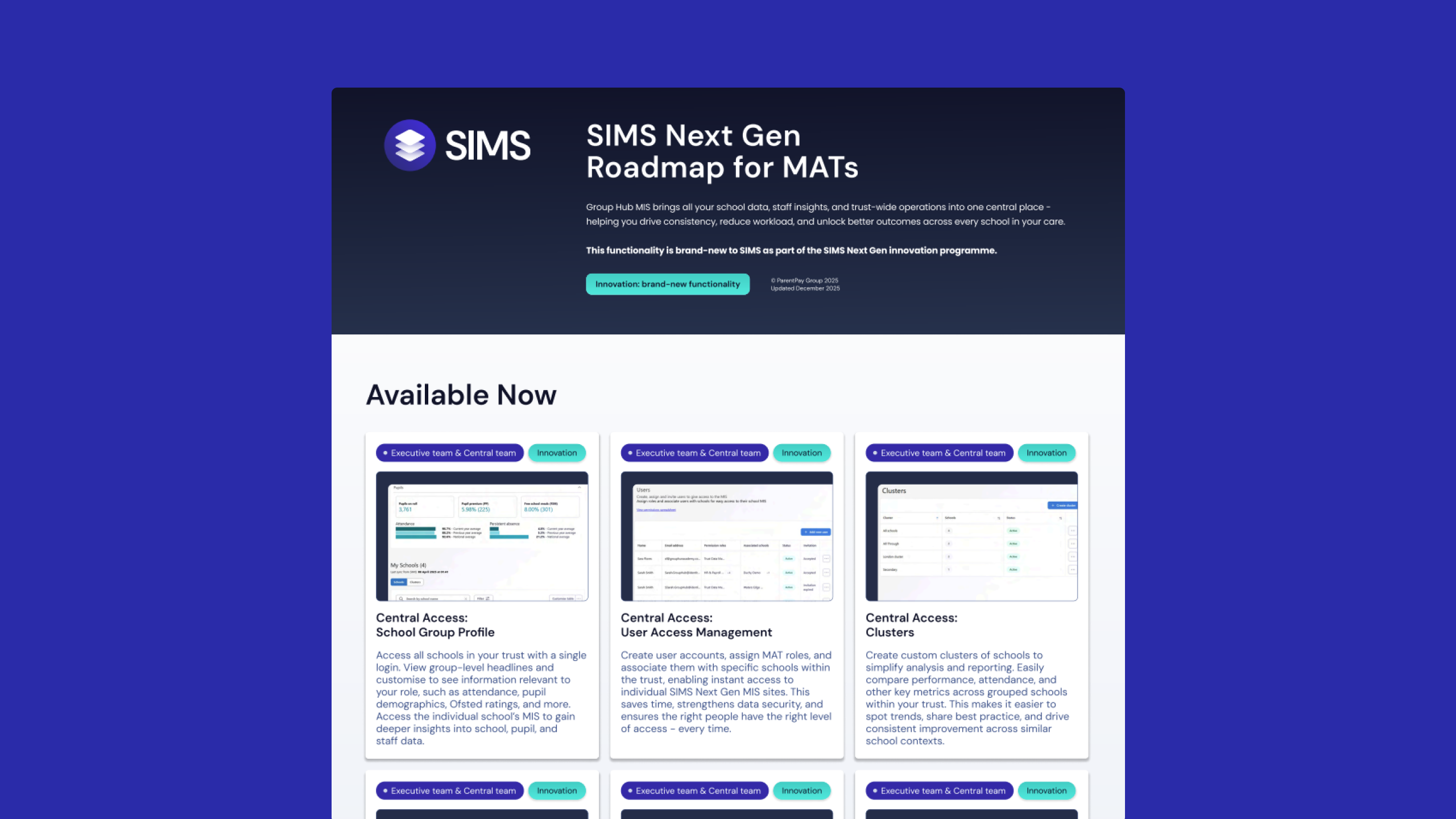 As part of this innovation programme, we’re also developing a brand-new centralised solution for Multi-Academy Trusts: SIMS Group Hub.