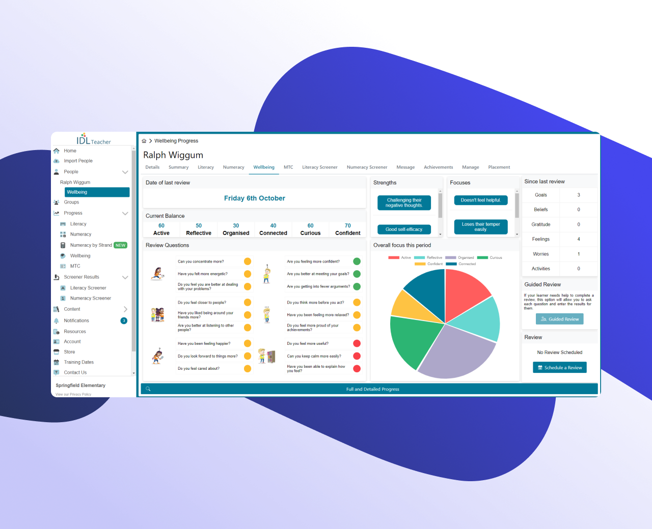IDL Wellbeing gives schools a simple way to track, understand, and support the emotional health of pupils. The programme uses guided questions to help learners reflect on how they feel, while teachers can view progress across key areas such as confidence, connectedness, and resilience. Clear reports highlight strengths and areas for focus, making it easier to provide timely support and celebrate progress.